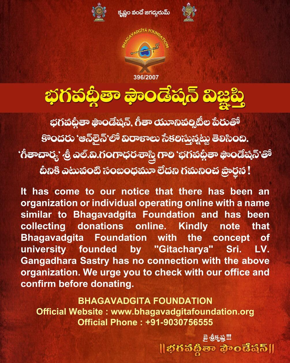 స్వార్ధ రహిత ఉత్తమ సమాజ నిర్మాణం కోసం 'భగవద్గీత' ప్రచారమే జీవిత ధ్యేయంగా,అందుకు 'భగవద్గీతా యూనివర్సిటీ' స్థాపనే అంతిమ లక్ష్యం గా - ప్రసిద్ధ గాయకులు, 'గీతాచార్య' శ్రీ ఎల్వీ గంగాధర శాస్త్రి 2007 లో 'భగవద్గీతా ఫౌండేషన్' అనే ఆధ్యాత్మిక, సామాజిక సంస్థను స్థాపించి,ఒక దశాబ్ద కాలం పరిశోధనాత్మక కృషి చేసి, ప్రపంచం లోనే తొలి సంగీత భరిత సంపూర్ణ భగవద్గీత ను తెలుగు తాత్పర్యం తో వెలువరించడం జరిగింది. 'భారత రత్న' డాII ఏ పి జె అబ్దుల్ కలామ్, భారత ప్రధాన మంత్రి శ్రీ నరేంద్ర మోదీ వంటి మహాత్ముల అభినందనపూర్వక ఆశీస్సులతో గత 15 సంవత్సరాలుగా దేశవిదేశాలలోనూ, సోషల్ మీడియా ద్వారానూ, ప్రసార మాధ్యమాల ద్వారానూ అనేక గీతా ప్రచార కార్యక్రమాలతో ప్రజలలో చైతన్యం తీసుకురావడానికి శ్రీ గంగాధర శాస్త్రి గారు కృషి చేస్తూ ఉన్నారు. కాగా ఆయన మార్గాన్ని అనుకరిస్తూ ఇటీవల మరొకరు తాము కూడా - తమ భగవద్గీతా ఫౌండేషన్ ద్వారా గీతా యూనివర్సిటీ ని నిర్మించదలచామంటూ ఆన్ లైన్ లో విరాళాలు సేకరిస్తున్నట్టు మా ఫౌండేషన్ కార్యాలయానికి వ్యక్తిగతం గానూ, ఫోన్ల ద్వారానూ అనేకమంది తెలియజేస్తున్నారు. అయితే ఈ తాజా సంస్థ తో శ్రీ గంగాధర శాస్త్రి గారు స్థాపించిన భగవద్గీతా ఫౌండేషన్ కి ఎటువంటి సంబంధమూ లేదని తెలియజేస్తున్నాము. అన్ని విషయాలూ భగవద్గీతా ఫౌండేషన్ కార్యాలయం ( 102, హిమసాయి పార్క్ వ్యూ అపార్టుమెంట్స్, రోడ్ నెంబర్ 5, బంజారా హిల్స్ , హైదరాబాద్ 500 034, ఫోన్ : 9030756555; Website : www.bhagavadgitafoundation.org ) ద్వారా వివరంగా తెలుసుకున్న పిమ్మట విరాళాలు అందించవలసిందిగా దాతలను విజ్ఞప్తి చేస్తున్నాము